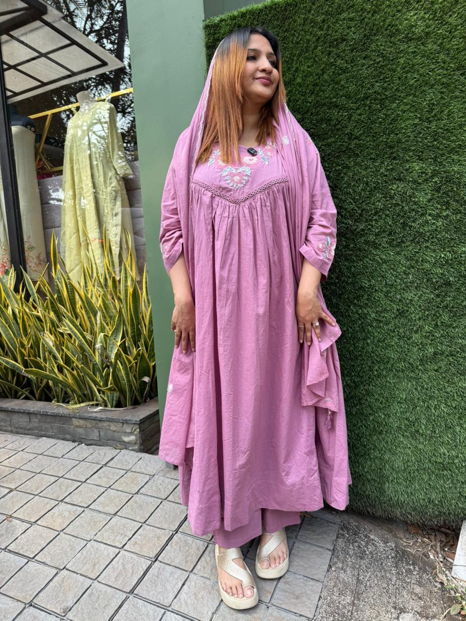 This cotton salwar set has a soft, graceful charm 🌸 Made from lightweight, breathable cotton, ideal for comfortable all-day wear, Comes in a beautiful dusty pink / mauve shade that looks elegant and soothing, The kurta features delicate floral embroidery on the yoke and sleeves, adding a subtle handcrafted touch, Designed with a gathered, flowy silhouette that gives a relaxed yet stylish look, Three-quarter sleeves enhance everyday comfort, Paired with a matching cotton bottom for a coordinated finish, Completed with a soft matching dupatta, perfect for a polished ethnic look