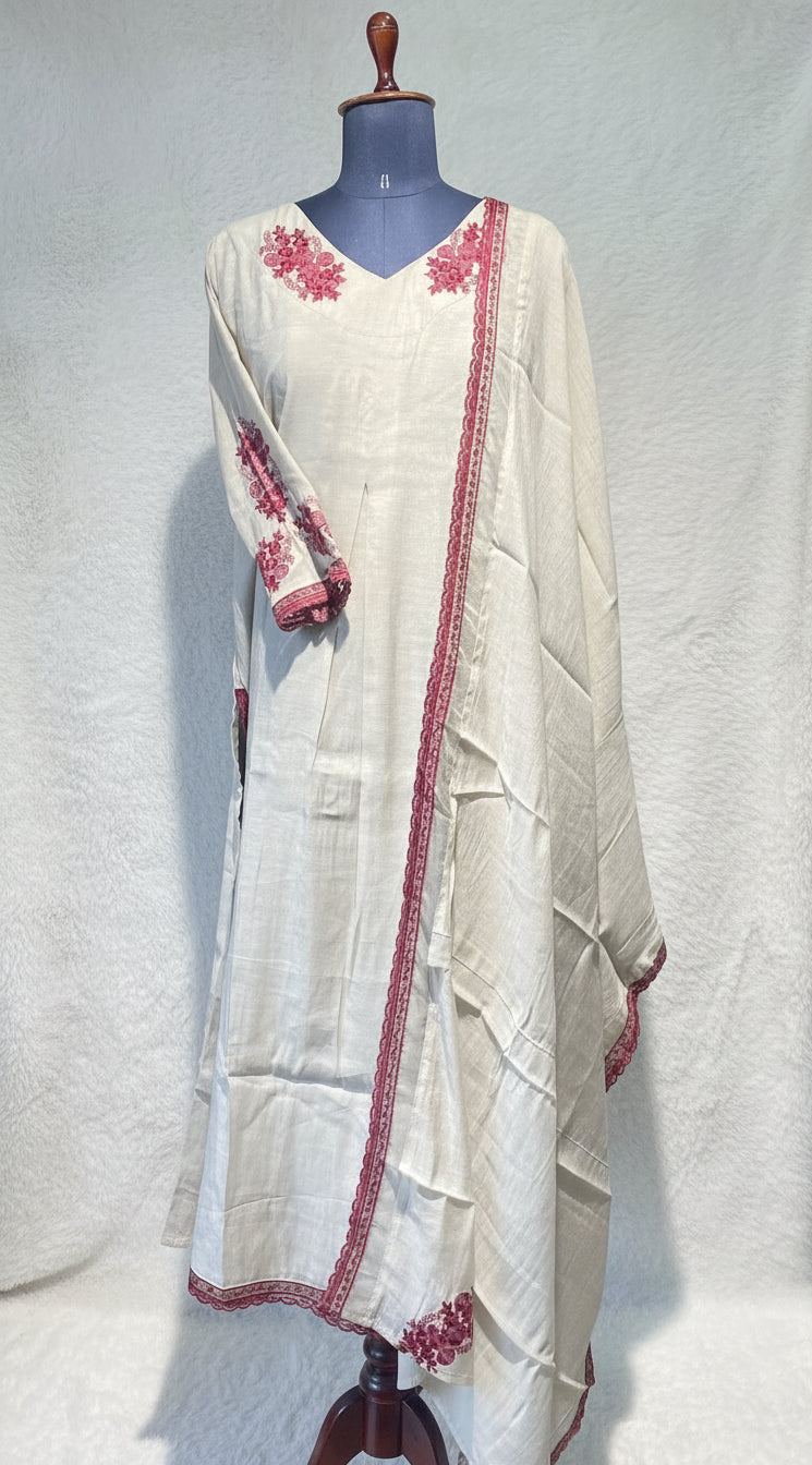 The dupatta is crafted from lightweight Chanderi fabric, embellished with a beautifully woven maroon border and delicate embroidery at the corners, complementing the kurta perfectly. The subtle sheen of the Chanderi material gives the outfit a premium and sophisticated finish.
