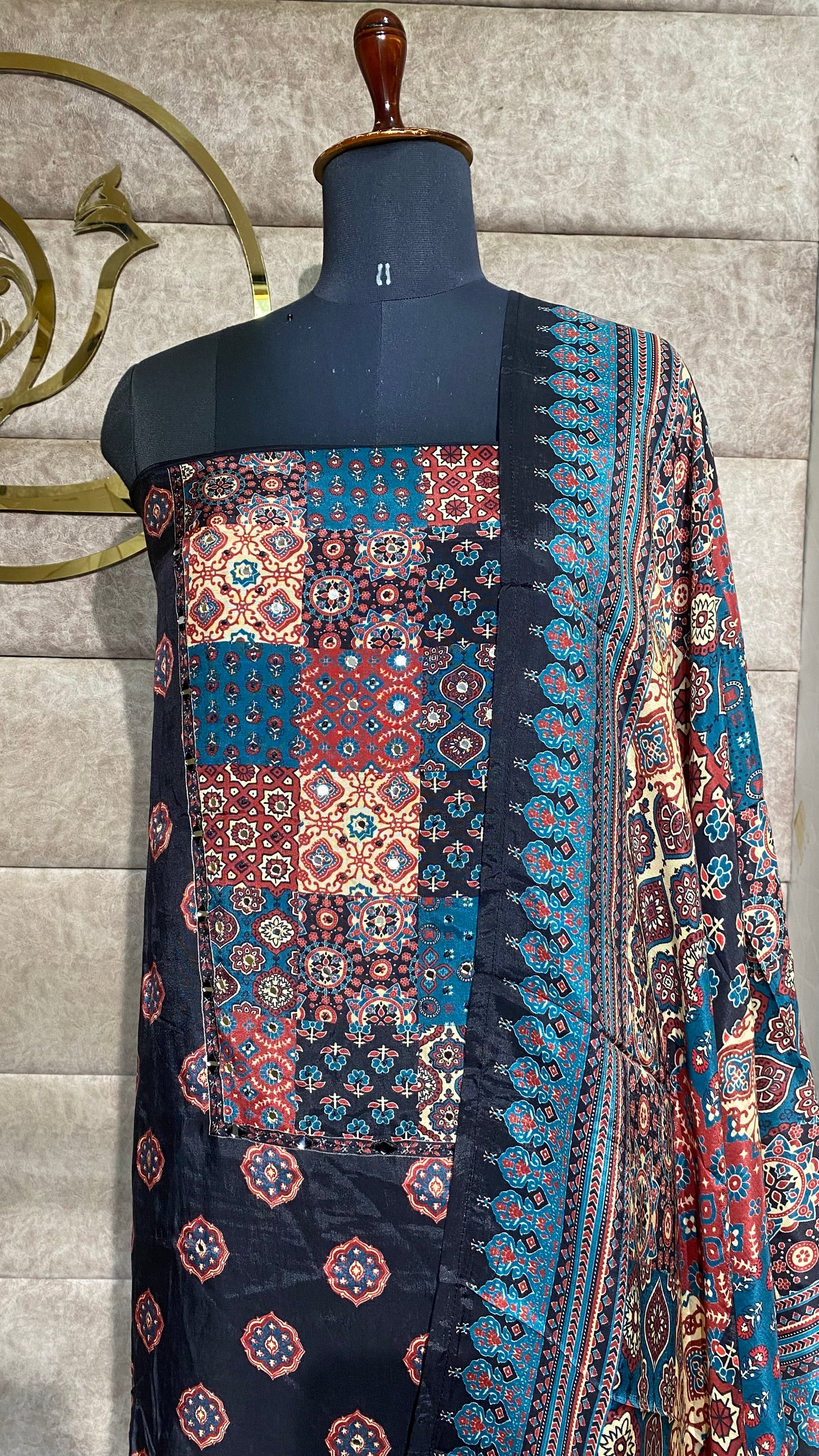 Design & Print: The top panel features a beautifully arranged patchwork-style print with traditional Ajrakh-inspired motifs in shades of teal, maroon, rust, and ivory