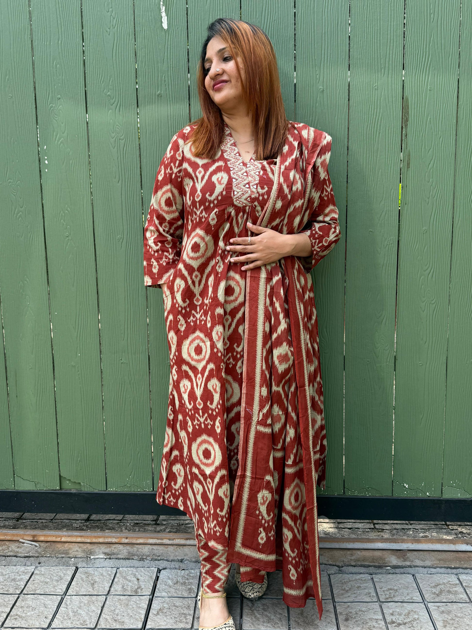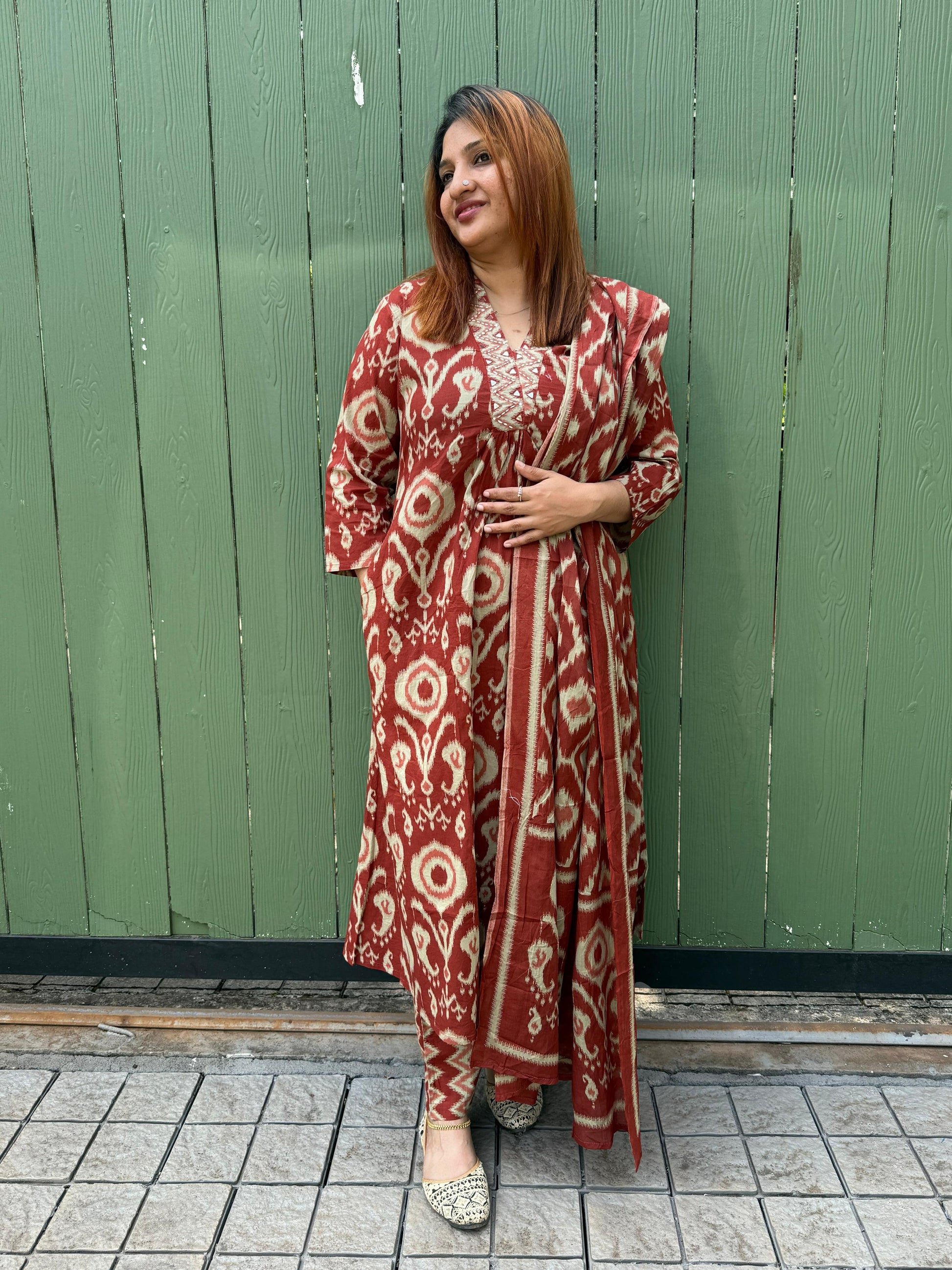 This cotton salwar set features a rich rust-red base with traditional ikat-inspired motifs in soft beige tones. The kurta has a straight, relaxed silhouette with three-quarter sleeves and a V-neckline highlighted by delicate embroidered detailing. It is paired with a matching printed salwar that complements the overall pattern and color palette. A coordinated dupatta with vertical ikat designs completes the set, giving it a cohesive and elegant look. The breathable cotton fabric and earthy hues make it ideal for everyday wear or casual festive occasions.