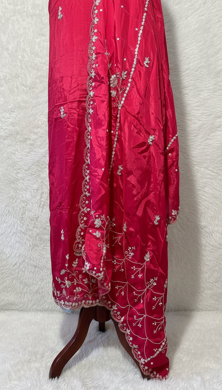 This is a rich and luxurious deep red salwar material crafted in a glossy, silk-finish fabric. The set features intricate golden and white thread embroidery along with delicate bead and sequin detailing, giving it a premium festive look. The dupatta is beautifully embellished with heavy floral embroidery and an ornate scalloped border, adding a touch of grand elegance. The overall design is perfect for weddings, receptions, and party wear, offering a regal and sophisticated appearance.