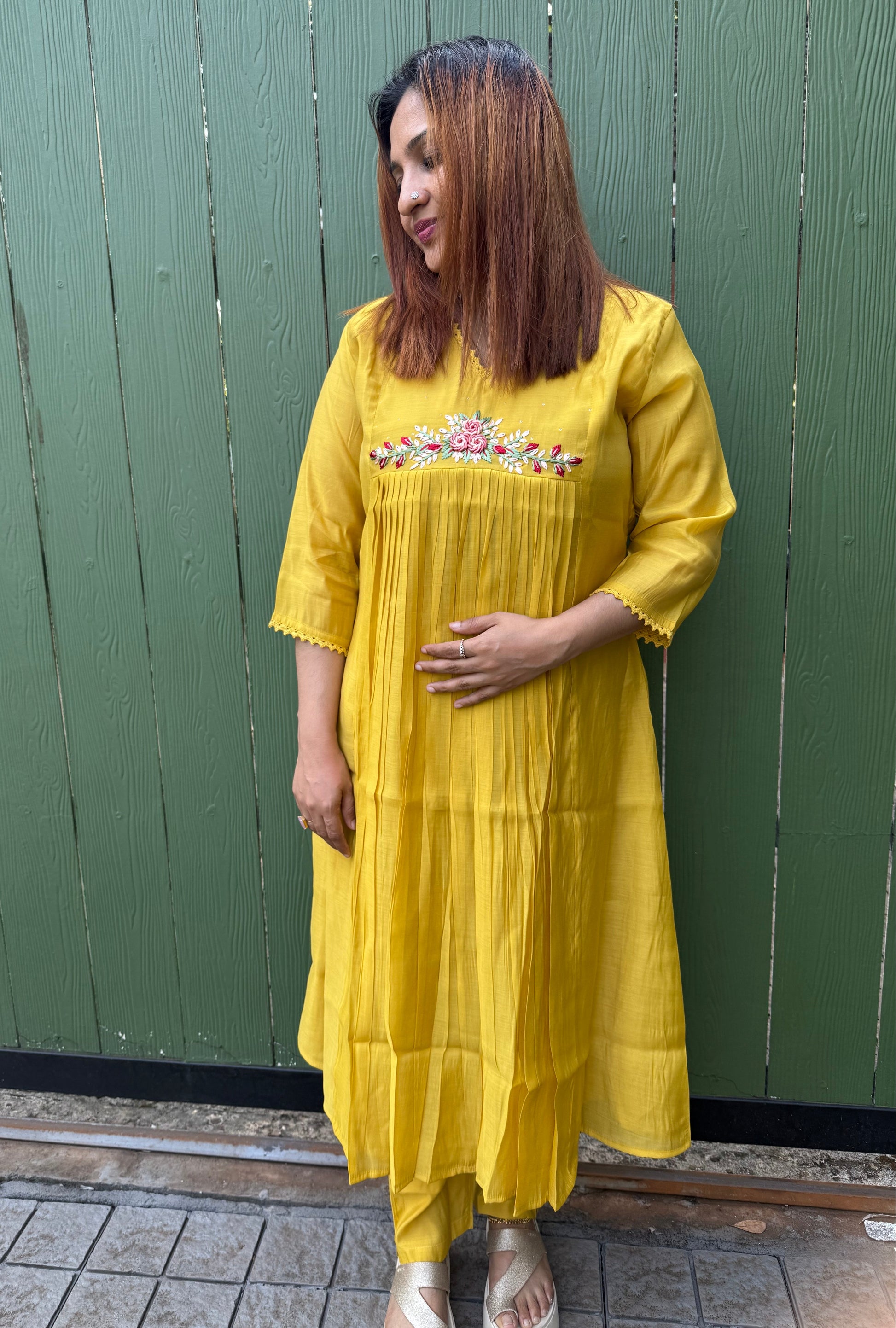 This ethnic co-ord set comes in a vibrant mustard yellow tone, giving a fresh and elegant daytime look. Top: A-line kurta-style top with a pleated front panel for a graceful flow. The yoke is beautifully highlighted with delicate floral embroidery, adding a soft feminine charm. Sleeves: Three-quarter sleeves finished with neat scalloped edging for a subtle ethnic touch. Bottom: Matching straight-fit pants that complete the coordinated, polished silhouette. Fabric & Feel: Lightweight, breathable fabric with a smooth drape—perfect for all-day comfort. Style Vibe: Bright, minimal, and effortlessly chic—ideal for office wear, casual outings, festive mornings, or everyday ethnic styling.