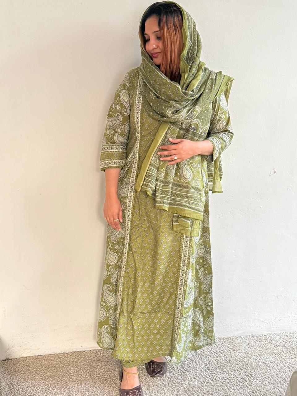 The kurta features an all-over traditional block-inspired print in muted green tones, highlighted with delicate ivory motifs. It is paired with a coordinated open-front jacket-style overlay that showcases contrasting paisley and border prints, adding depth and elegance to the look. The three-quarter sleeves and straight silhouette keep it comfortable yet stylish.