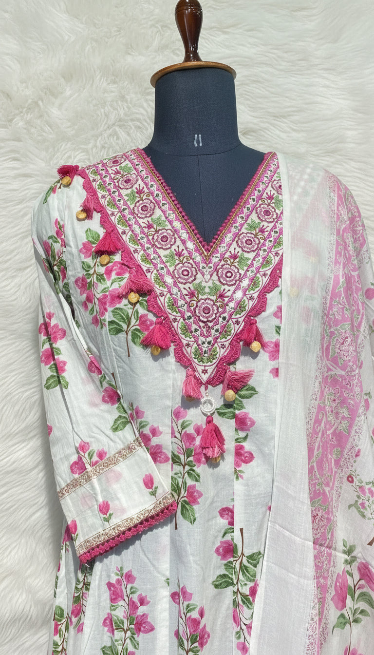 This is a charming white and pink cotton salwar set featuring a refreshing floral print that gives it a soft, elegant appeal. The kurta comes with a beautifully embroidered V-neckline adorned with intricate thread work and cute tassel detailing, adding a festive and stylish touch. The three-quarter sleeves carry matching floral motifs with a delicate lace border at the cuff.