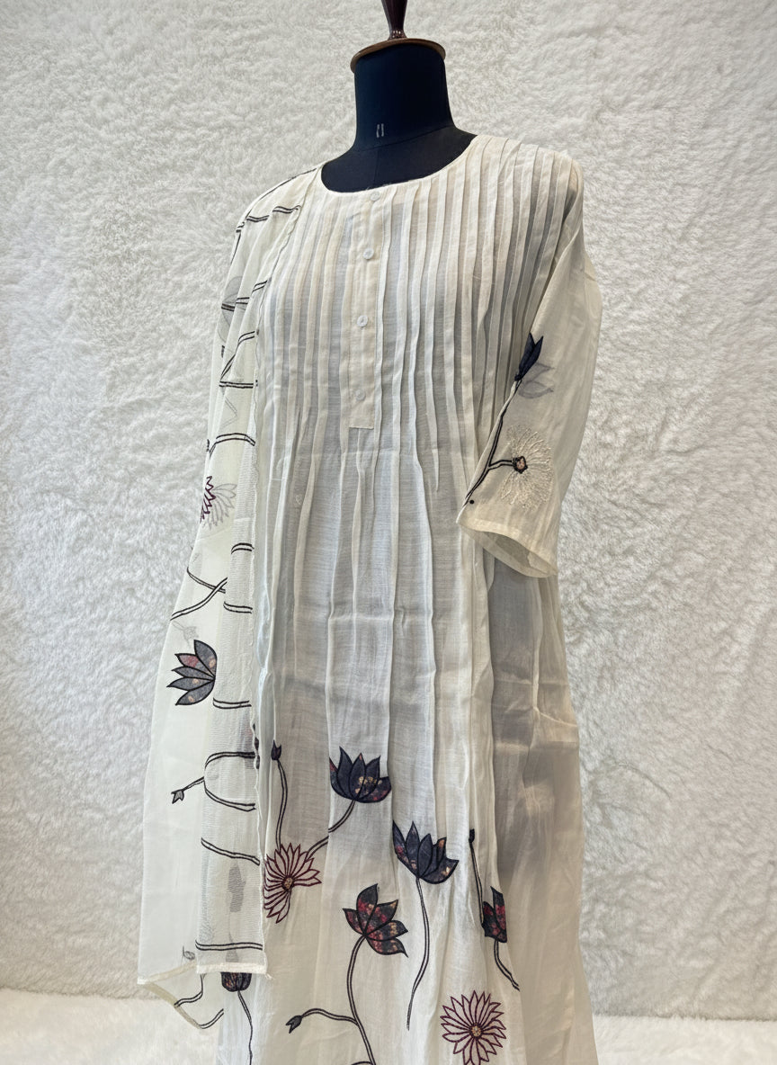 The set is paired with a stunning dupatta adorned with intricate floral and lotus embroidery, adding a charming artistic touch. The threadwork in contrasting shades enhances the overall appeal, making it perfect for festive gatherings, casual outings, and elegant daytime events. This is a blend of simplicity and artistry, this salwar suit is a timeless addition to your wardrobe.