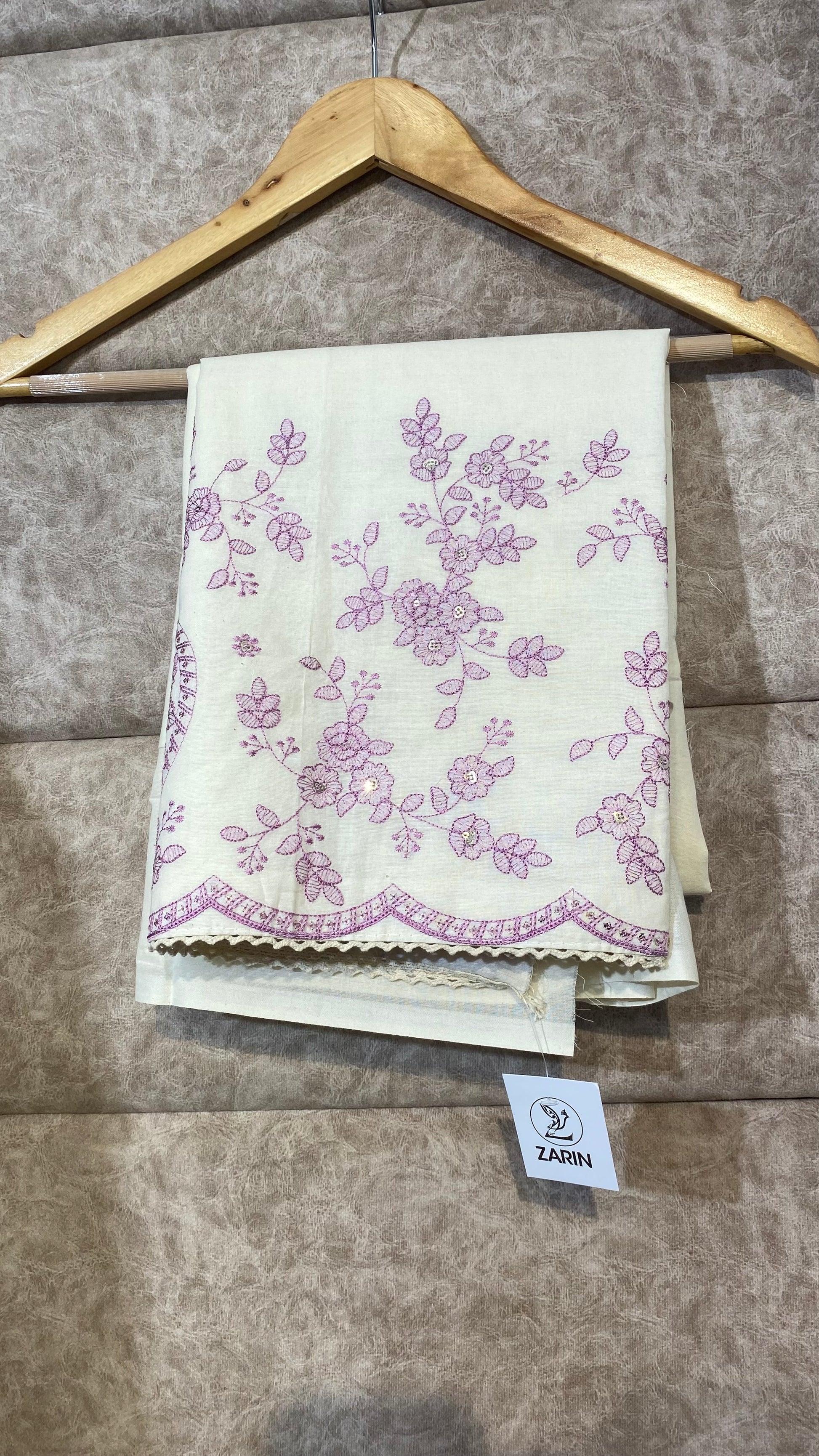 This is a delicate Mul Chanderi salwar set with a soft, feminine charm 🌸🤍 Kurta Fabric: Premium Mul Chanderi in an elegant ivory/off-white base, known for its light weight, airy feel, and subtle sheen. Embroidery: Beautiful lavender floral embroidery spread evenly across the fabric, giving a calm and graceful look. The floral motifs are fine and detailed, adding a handcrafted touch. Neckline & Border: Enhanced with a scalloped embroidered border running along the neckline panel and edges, finished with fine lace detailing for an elegant finish. Dupatta: Matching Mul Chanderi dupatta with coordinated lavender floral embroidery and a decorative scalloped border, creating a soft, flowy drape. Bottom: Coordinated plain bottom fabric to balance the embroidered kurta and dupatta. Overall vibe: Subtle, classy, and timeless—perfect for festive mornings, pooja wear, summer functions, or elegant day occasions.