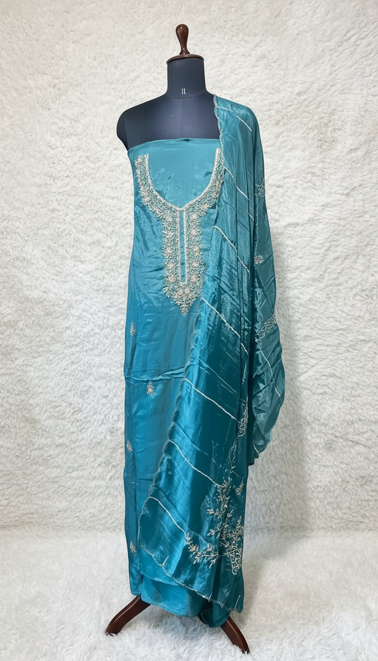 This is a beautiful teal blue silk-blend salwar material featuring a rich glossy finish that gives it a luxurious and festive appeal. The kurta is highlighted with elegant silver thread embroidery along the neckline, designed in intricate floral and vine motifs that instantly elevate the look. The embroidery continues in a vertical pattern, adding a graceful elongated effect to the outfit.