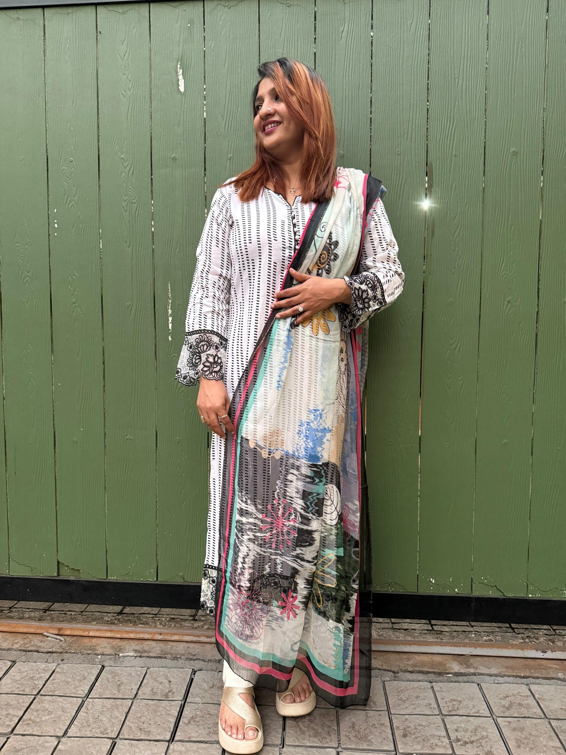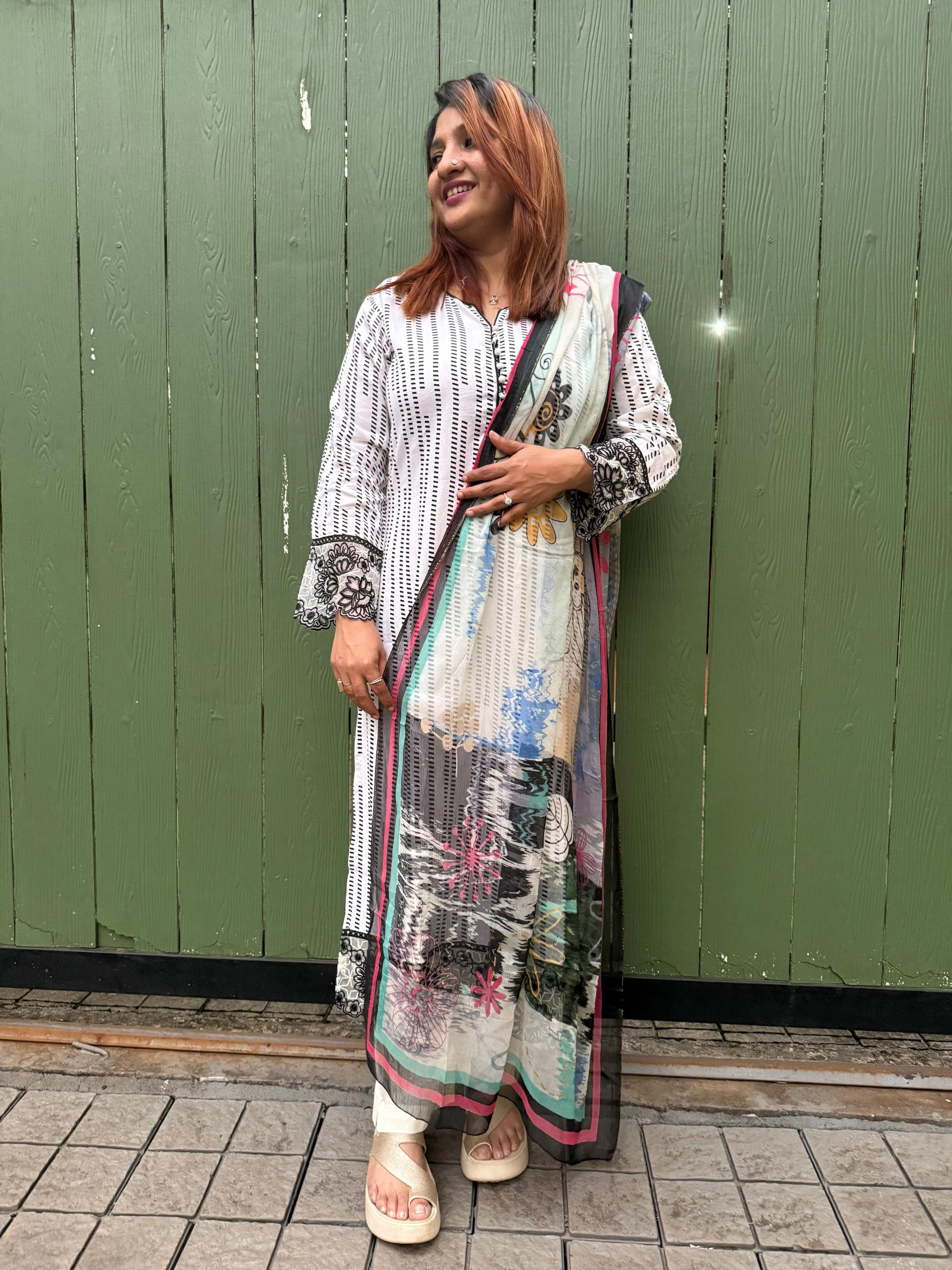 This is a white salwar set with a straight-cut kurta. The kurta has fine black dotted stripes all over. The sleeves feature black floral embroidery at the cuffs. A printed dupatta is draped over one shoulder. The dupatta has multicolor floral and abstract patterns. Soft shades of blue, pink, green, and black stand out. The salwar is light-colored and simple. The overall look is elegant and comfortable.